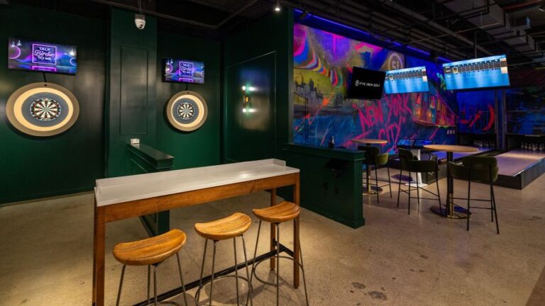 Beyond game improvement, the space is designed to bring people together and elevate corporate entertainment. Duckpin bowling offers a relaxed but competitive outlet, while Dartsee, a projection-based twist on darts, makes every match an interactive experience. The simulators unlock access to more than 300 world-renowned golf courses, with skill challenges for any ability and multi-sport options like soccer, baseball, and hockey. At the center, a full-service restaurant and bar featuring a chef-driven menu and craft cocktails creates an elevated backdrop for corporate gatherings, holiday parties, client events, or simply a night out with friends.