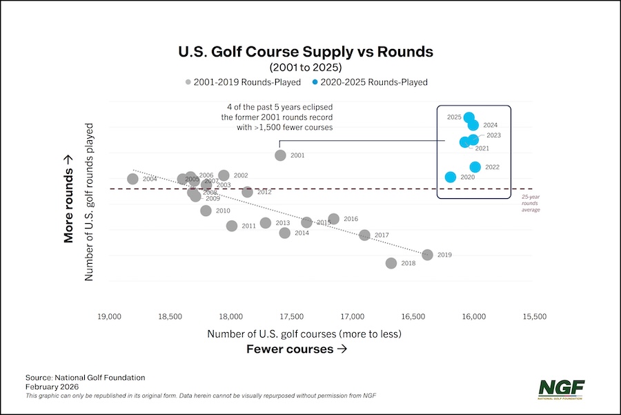 At first glance, the current run invites comparisons to the early-2000s “Tiger boom,” when the sport rode a wave of popularity fueled by Tiger Woods’ dominance. But today’s record-setting levels are fundamentally different — and more impressive — than those achieved two decades ago. This is not an apples-to-apples comparison. Current play levels are being achieved with as many as 2,000 fewer golf courses than existed during the earlier 2000s peak, meaning demand is being absorbed by a significantly smaller supply of green-grass facilities. For more on the 1986-2005 building boom and the subsequent market correction, click here.