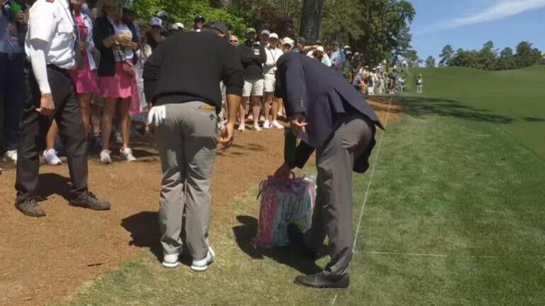 The Masters makes just about everything one can imagine from polos, T-shirts and hats to dog bandanas, lawn gnomes and blankets, but one patron found an unexpected item in her bag on Thursday afternoon when Xander Schauffele’s drive bounded into it left of the 8th fairway.